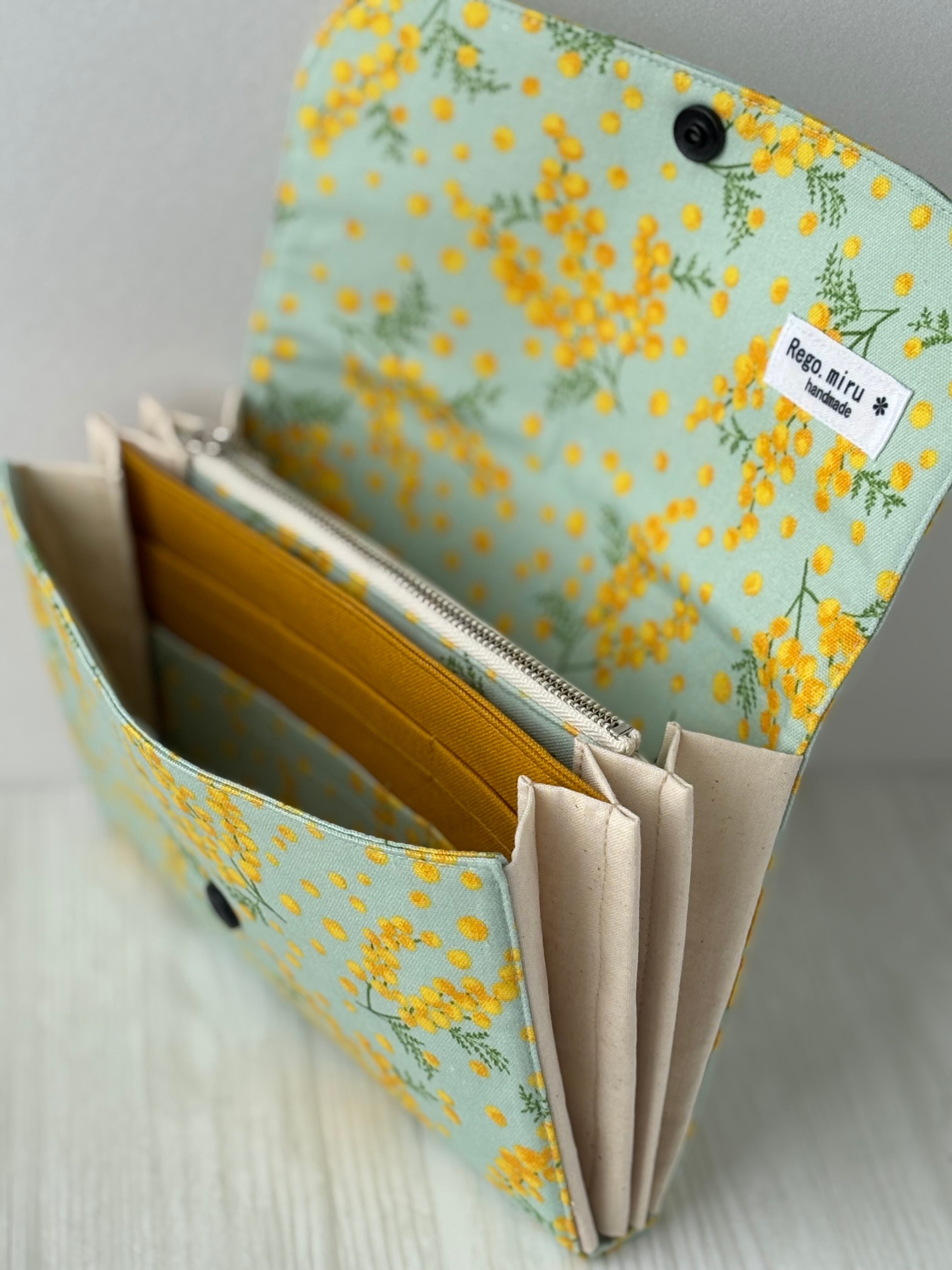 ミモザ柄のじゃばらデザインが華やかで、たっぷり収納できる優れものです。大切な母子手帳や通帳をしっかり守りながら、持ち運びも楽々なアイテムです❋
